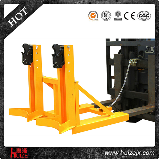 適用于桶邊薄和變型的桶,純機械機構設計可與叉車方便地配合,僅依靠叉車的動作,不需要其它的動力,可自動一次搬運2個桶,能處理更多類型的桶,包括鋼制油桶和塑料油桶,能在集裝箱等這樣狹小的環(huán)境內裝卸桶裝物質,可極大地提高空間利用率, 與貨叉連接配有自鎖裝置確保油桶夾在坡度上和顛簸路面使用時不會滑落.